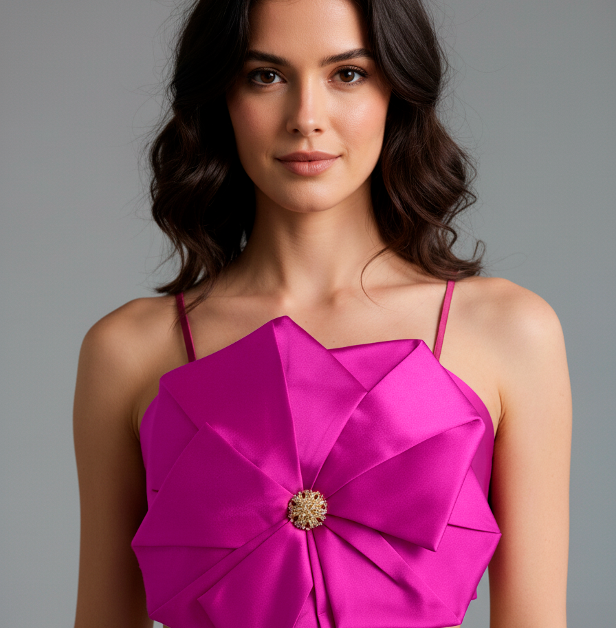 Top corto de tirantes finos, confeccionado en tela satinada color fucsia intenso. Destaca por su gran flor estructurada al frente con pliegues geomƩtricos y un broche central dorado con brillo. Ideal para looks de fiesta o eventos especiales.