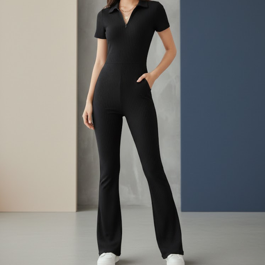 Moderniza tu guardarropa con este jumpsuit negro de tejido acanalado, la definición de la moda de una sola pieza. Su diseño combina la sofisticación de un polo con cuello y la comodidad de un pantalón acampanado (flare), creando un look perfectamente estilizado.